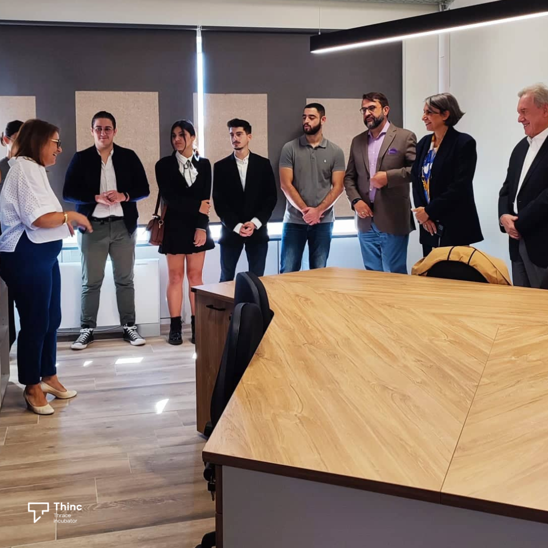 Έπειτα από μια σύντομη ξενάγηση στις εγκαταστάσεις της Thinc, ο κ. Κυριαζής παρακολούθησε παρουσιάσεις των φοιτητικών ομάδων του Δημοκριτείου Πανεπιστημίου Θράκης, οι οποίες παρουσίασαν το έργο και το όραμά τους. Μαζί τους και μία υποψήφια επιχειρηματική ομάδα στο πρόγραμμα της Thinc Thrace incubator, η οποία ιδρύθηκε από καθηγητές του Πανεπιστημίου. Ο κ. Κυριαζής έδειξε έντονο ενδιαφέρον για τις ομάδες και υπογράμμισε τη σημαντικότητα της συμβολής της Thinc στο έργο τους.